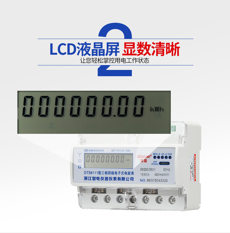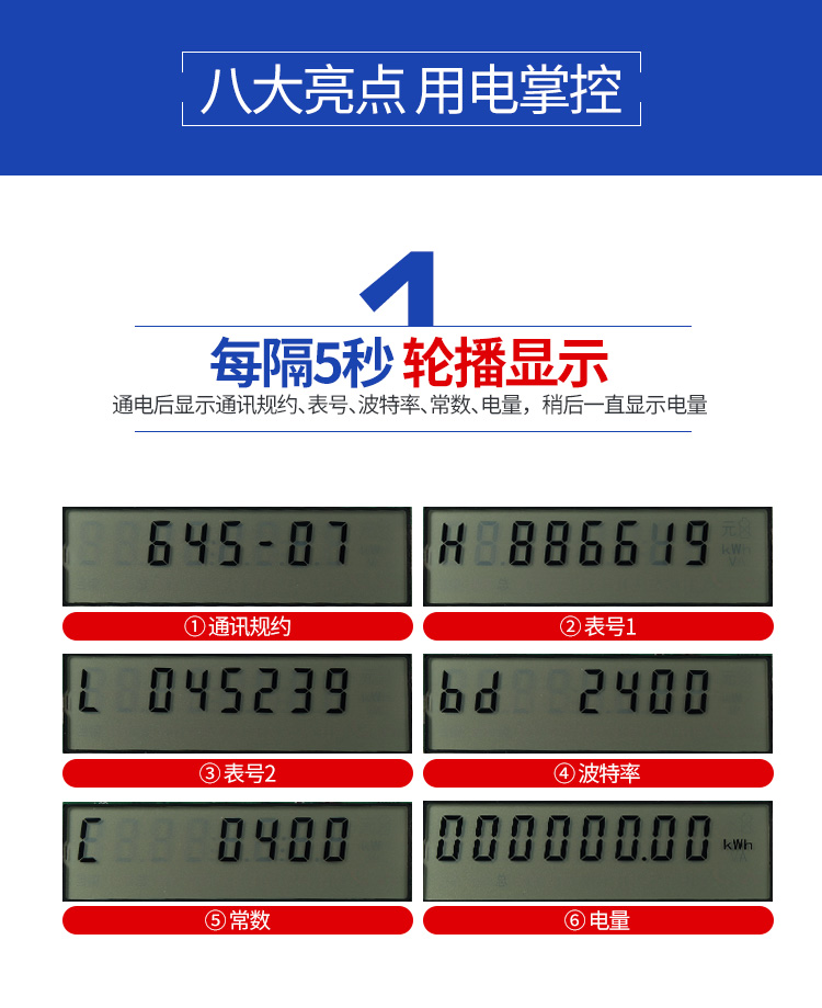 5.显示功能 :采用宽温大液晶方式显示各类信息;电能量显示位数为6为整数,2为小数,具有参数自动轮显功能。