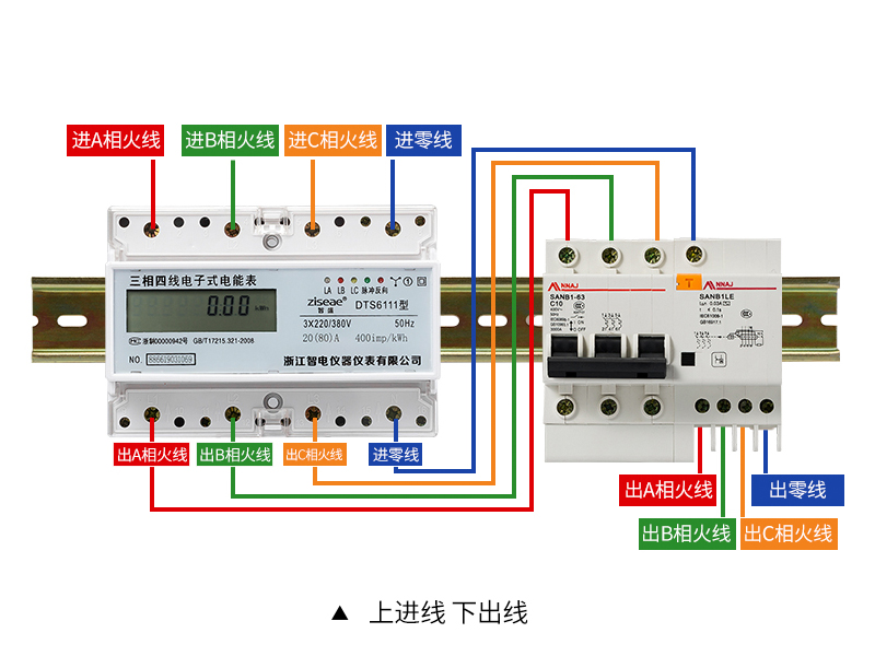 三相四线制,在低压配电网中,输电线路一般采用三相四线制,其中三条线路分别代表A,B,C三相,另一条是中性线N或PEN电源侧的中性点接地,则中性线也称为零线(老式叫法,应逐渐避免,改称PEN,如果不接地,则从严格意义上来说,中性线不能称为零线)。在进入用户的单相输电线路中,有两条线,一条我们称为相线L,另一条我们称为中线N,中线正常情况下要通过电流以构成单相线路中电流的回路。而三相系统中,三相平衡时,中性线(零线)是无电流的,故称三相四线制;在380V低压配电网中为了从380V线间电压中获得220V相间电压而设N线,有的场合也可以用来进行零序电流检测,以便进行三相供电平衡的监控。三相导轨式电表的接线方式有区别老式背挂式电表,具体接线方式如下: