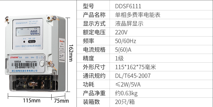 DDSF6111单相电子式多费率电能表,采用单片机处理系统设计而成,具有电路简单、可靠性高、成本低等优点。该产品软件、硬件、结构设计技术先进,计量精度高,结合单片机资源,实现电能分时计量,具有红外及RS-485通信功能,抗干扰、防攻击性能好,工作温度范围宽,能长期稳定可靠工作。该产品各项性能指标符合国家GB/T 17215-2002《1级和2级静止式交流有功电能表》、GB/T 15284-2002《复费率(分时)电能表特殊要求》、DL/T 645-2007《多功能电能表通信规约》等标准的技术要求。