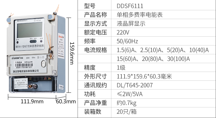 DDSF6111单相电子式多费率电能表,采用单片机处理系统设计而成,具有电路简单、可靠性高、成本低等优点。该产品软件、硬件、结构设计技术先进,计量精度高,结合单片机资源,实现电能分时计量,具有红外及RS-485通信功能,抗干扰、防攻击性能好,工作温度范围宽,稳定可靠工作。该产品各项性能指标符合国家GB/T 17215-2002《1级和2级静止式交流有功电能表》、GB/T 15284-2002《复费率(分时)电能表特殊要求》、DL/T 645-1997《多功能电能表通信规约》等标准的技术要求。