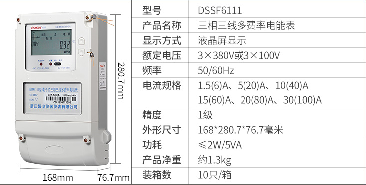 DTSF6111三相四线 DSSF6111三相三线电子式多费率电能表(尖峰平谷电表)是我公司开发的,具有分时计量用户所用电能功能,并可实现多种用电费率计费和集中抄表功能的电能计量电能表,该表技术性能符合GB/T17215.321-2008《1级和2级电子式交流有功电度表》和GB/T15284-2002《复费率(分时)电度表》国家标准的要求,适用于计量额定频率为50Hz或60Hz三相交流有功电能。