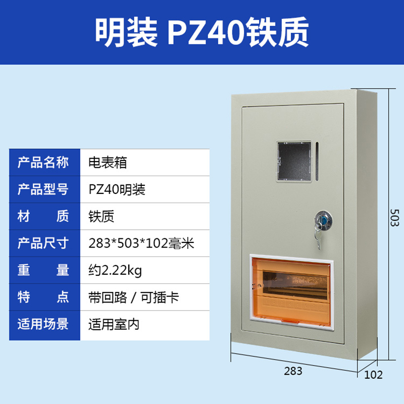 我公司生产的PZ40电表箱采用0.5-1mm厚冷轧钢板和进口PC高透视窗,并带有门锁,安全防盗,大气美观。可安装各类电能表和C45、空气开关、断路器闸刀等,广泛用于家庭、公寓、学校、工厂等场所。