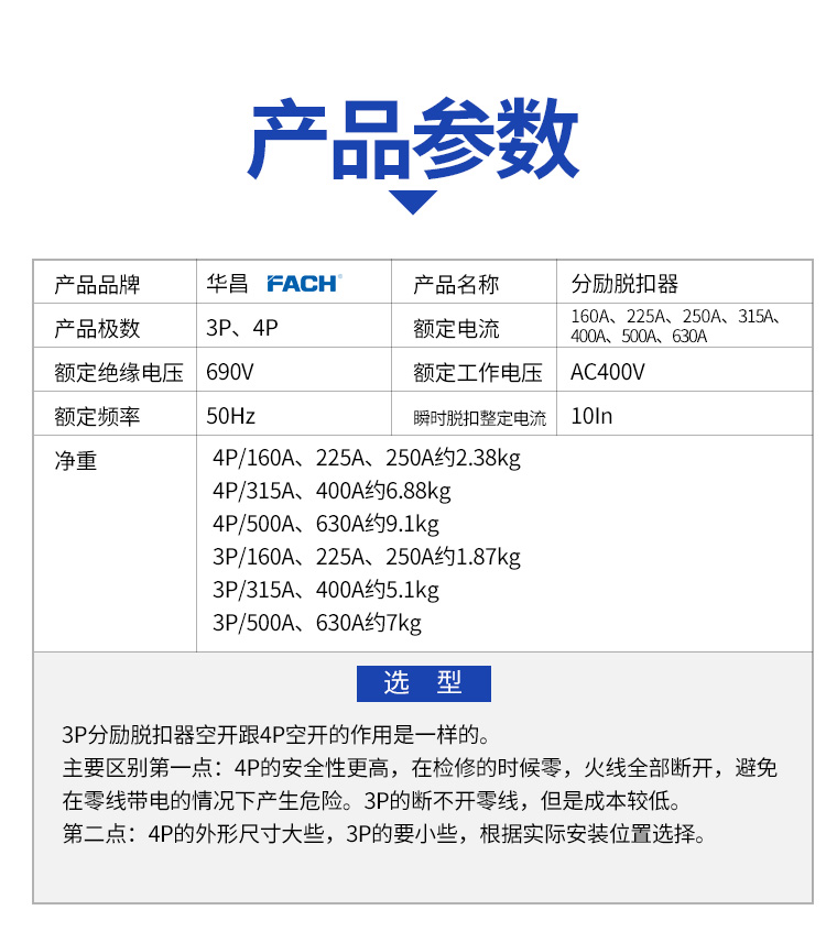 (3)4P和3P分励脱扣断路器的电流范围:160A、200A、 225A、250A、315A、400A、500A、630A、800A等